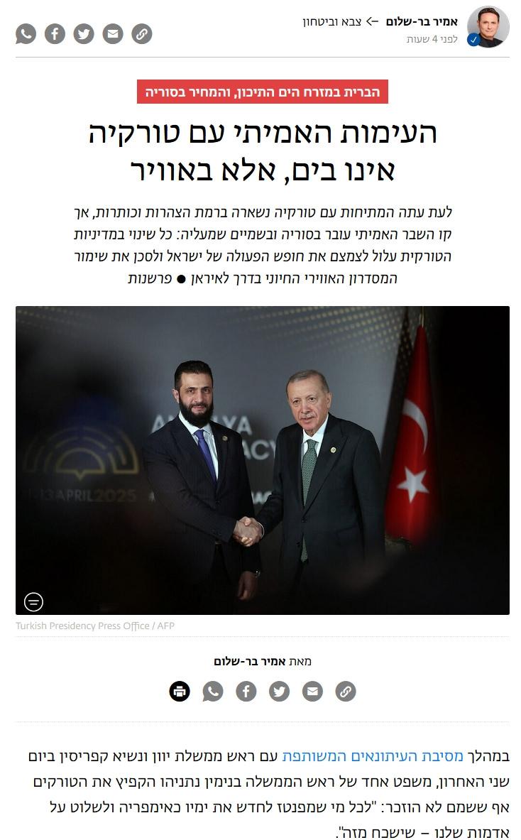 İsrail merkezli yayın organı zman.co.il’de Amir Bar-Shalom imzasıyla yayımlananTürkiye ile gerçek çatışma denizde değil, havada” başlıklı haberde, Türkiye’nin bölgesel gücünden duyulan derin endişe gözler önüne serildi. Analiz haberde, Türkiye ile İsrail arasındaki asıl gerilimin sadece deniz yetki alanlarında değil, Suriye hava sahasındaki dengelerde yaşanabileceği belirtildi.