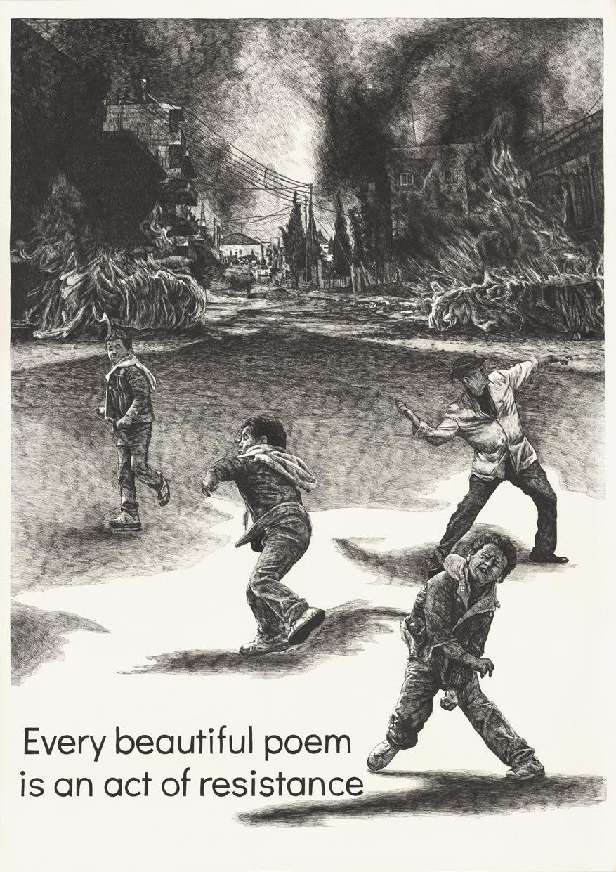 Pek çok eser, Filistin’in “ulusal şairi” olarak anılan Mahmud Derviş’in dizelerinin izlerini taşır. Sergi boyunca bu dizeler, dalların arasından geçen bir rüzgar gibi yankılanır;  Derviş’in sözleriyle Aygeç’in imgeleri arasında ince, sezgisel bir hafıza hattı kurar. Sürgündeki Zeytin Ağacına Posterler, İsrail’in 2023 sonrasında Gazze’ye yönelik saldırılarının yol açtığı insani felaket karşısında sanatın etik bir tanıklık alanı olarak üstlendiği rolü vurgular. Sergi, izleyicileri bir trajediyi yalnızca gözlemlemeye değil; hatırlamaya ve hatırlatmaya—tarihin yaşamları, hikâyeleri ve coğrafyaları silmeye yönelen mekanizmalarına karşı direnmeye—davet eder.