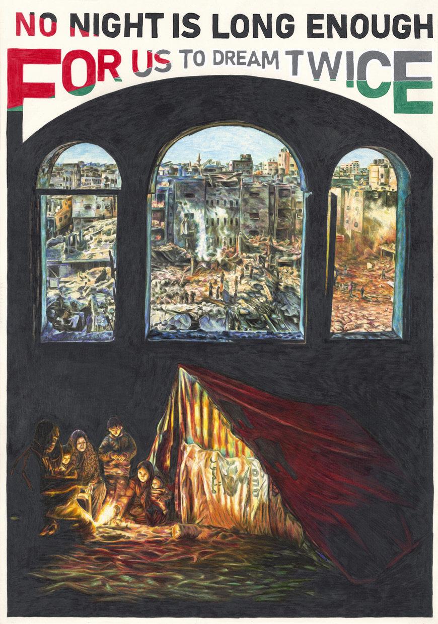 2023 Ekim’inden bu yana Gazze, tüm mahallelerin yok edilmesine, yüz binlerce insanın yerinden edilmesine ve sivillerin sistematik biçimde hedef alınmasına tanık oldu. Bu dönem, uluslararası topluluğun birçok kesimi tarafından insanlığa karşı suç ve bir soykırım eylemi olarak tanımlanmaktadır. Aygeç’in eserleri bu yıkımı görsel olarak yeniden yaratmayı amaçlamaz; bunun yerine, bu tür bir kopuşun psikolojik ve duygusal  ankılarını görünür kılar. Çizimler, silinmeye karşı bir görsel arşiv görevi görür; unutmanın politik bir araç haline geldiği durumlarda  atırlamakta ısrar eden estetik bir direniş alanı oluşturur.